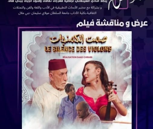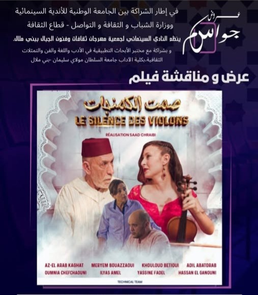 Dans le cadre d’un partenariat entre la Fédération nationale des clubs cinématographiques, le ministère de la Jeunesse, de la Culture et de la Communication, secteur de la Culture à Beni Mellal, et en collaboration avec le Laboratoire des recherches appliquées en littérature, langue, arts et représentations culturelles de la Faculté des Lettres de l’Université Sultan Moulay Slimane, le club cinématographique de l’Association Festival Culture et Arts des Montagnes de Beni Mellal a organisé ,Vendredi 30 Janvier 2026 , au centre culturel , à Beni Mellal ,une projection-débat du film « Le Silence des Violons », en présence du réalisateur Saad Chraibi.
